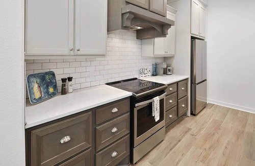 Fall in love with our modern farmhouse dream home! It is a perfect blend of elegance, comfort, and serenity. The spacious open floorplan is perfect for entertaining and family gatherings. The gourmet kitchen is a chef's delight, featuring stylish quartz countertops, stained wood cabinetry, and an eat-in bar, which is perfect for casual dining. The primary bedroom, located on the first floor, is a luxurious retreat, featuring a comfortable king-size bed and an ensuite bathroom with a large walk-in closet, oversized shower, and double vanity. The downstairs guest room features a cozy queen-size bed and a full bath with a tub/shower. The upstairs guest room provides additional privacy, a small sitting area, a king-size bed, and a full bathroom with tub/shower combo. The split floorplan ensures each guest has their own space and privacy. The laundry room is available for guest use, including the washing machine and dryer. The covered patio and fenced backyard offer a perfect outdoor oasis for relaxation and tranquility. The backyard backs up to the greenbelt with large oak trees, providing a peaceful and serene environment. Whether you're looking to host a family gathering or finding a place to slip away for a relaxing retreat, this beautiful townhome has everything you need to make your stay unforgettable! Guests can enjoy the neighborhood amenities that Oakmont has to offer such as the splashpad, playground, and more than 9 miles of walking and biking trails. We are available during your stay, should you need anything. The Oakmont community is centrally and conveniently located only 15 minutes to Texas A&M and all that Bryan/College Station has to offer. The community includes a clubhouse, pool, splashpad, gym, event center, playground, and miles of walking trails. Parking is available in the garage for 2 vehicles and 2 additional vehicles in the driveway. On-street parking is also available.