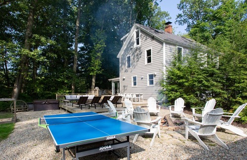 Dogwood’s 1,800 square foot outdoor area includes a large wrap-around wood deck, hot tub, outdoor dining area with gas grill, outdoor ping-pong table, and fire pit. The property’s large backyard on the 2-acre lot creates an idyllic backdrop for outdoor activities of all kinds.