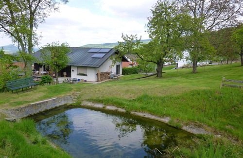 Our 45 m² apartment was recently renovated. In the living room / bedroom you will find a large double bed, a sofa bed in the sitting area, a corner bench with dining table and a fully equipped kitchenette. Of course, satellite TV and radio are available. A barrier-free shower and a urinal were installed in the bathroom next to the toilet and vanity. In addition to the separate entrance there is a drying room for e.g. B. Hiking or biker clothing. In the large adjoining orchard with pond you can move freely and find a shady or sunny spot depending on your mood.