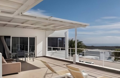 In the quiet, rural countryside outside of Tias centre, the elegant holiday home Casa Amanecer 4 offers fantastic sea views and a great central location to explore the diverse regions of Lanzarote. The modern apartment consists of of 2 open plan living/dining areas, both with very well equipped, integrated kitchenettes(one with a dishwasher), 3 bedrooms (one with 2 single beds) as well as 2 bathrooms and can therefore accommodate 6 people. Additional amenities also include Wi-Fi, a washing machine and cable TV, as well as a baby bed and high chair. On your private terrace, which is equipped with a dining area, you can enjoy delicious meals with a view of the beautiful mountain panorama. Take a refreshing dip in the private pool surrounded by tropical vegetation and enjoy the views of the sea, Fuerteventura and the island of Lobos. A supermarket and several restaurants are only 1.5 km away or 2 minutes by car. In 4 minutes by car (4 km) you can also reach the centre of Tias with a variety of shops and restaurants. For those who wish to get a tan on the soft sand of the nearby coast, the beaches Playa de los Pocillos and Puerto del Carmen are a 7-minute(7 km) drive away.