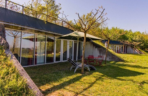 Les Collines de Ste Féréole offers 25 modern holiday houses with WiFi. They are spread across four hectares of hilly countryside with an open view of Bassin de Brive lake. The houses are nestled in the heart of the hill, keeping them nice and cool in summer and pleasantly warm in winter. There are three different kinds of houses: a 2-person one-bedroom (FR-19270-08), a 4-6 person two-bedroom (FR-19270-09) and a 6-8 person two-bedroom that has two bathrooms (FR-19270-10). The houses are constructed of raw concrete in a minimalist style with green roofs. The furnishings are modern. All houses have large windows and a private terrace with garden furniture. The beds are made on your arrival. Cars are parked at the central car park.