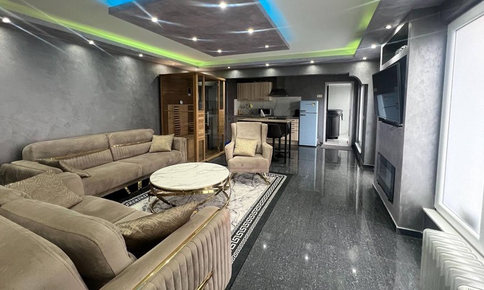 Layout: Ground floor: (hallway, Living room(double sofa bed, fireplace, decorative fireplace), dining room(dining table), Kitchen(electric kettle, cooker, espresso machine, oven, microwave, fridge-freezer), bathroom(shower, washbasin), fitness room(fitness equipment)) On the 1st floor: (bedroom(double bed), bedroom(double bed), bedroom(double bed), bathroom(massage shower, washbasin), Turkish steambath) Annex: (Entrance, Living room(TV), dining room(dining table), Kitchen(cooker, coffee machine, oven, microwave, fridge-freezer), bedroom(double bed), bathroom(shower, washbasin), Bubble bath, infrared sauna) infrared sauna, air conditioning, terrace, terrace, terrace, BBQ, private indoor pool
