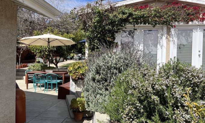 This bungalow style house was built in the early 1900s, which adds to its style and charm. It’s been newly renovated kitchen and bathrooms add modern comfort and style. Four bedrooms, two with king beds and two with two twins each, which sleeps up to 6 adults and two kids comfortably. One room has a bunk bed. The house has three full bathrooms, one living room, one dining room, and a hallway with a washer and dryer. Outside, in the backyard, guests can enjoy a patio with a table, fire pit, grass, fruit trees, and a garden area. To the front, guests can sit on the porch or under the shade of mature Elm and Sycamore trees.