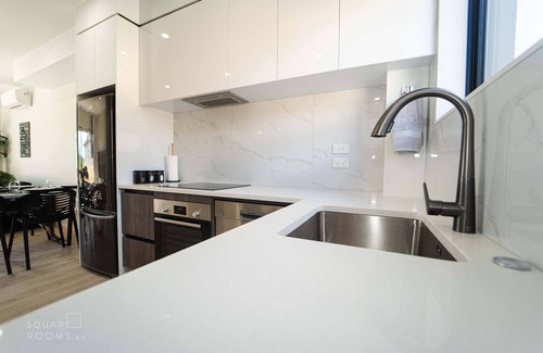 The ground floor features an open-plan kitchen dining and living area that opens up to a sunny deck courtyard space, providing the perfect spot to relax and unwind. The stylish minimal modern kitchen is perfect for hosting meals and gatherings. The ground floor also includes a single garage, laundry area and a toilet powder room, making it convenient for guests.