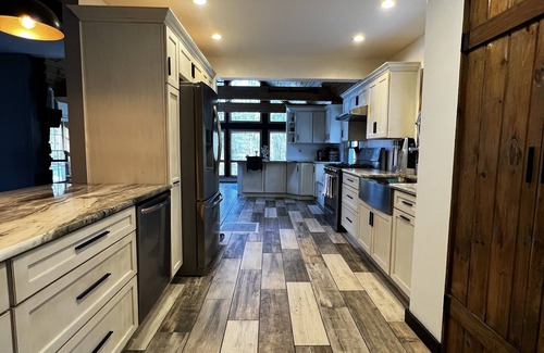 The house has been fully renovated and remodeled with design-forward elements throughout. From a 20 foot tall gallery wall in the sun-filled great room, to a sleek speakeasy lounge in the basement, guests can enjoy all the Poconos has to offer in a modern oasis surrounded by nature, wildlife, and a creek running through the property.
