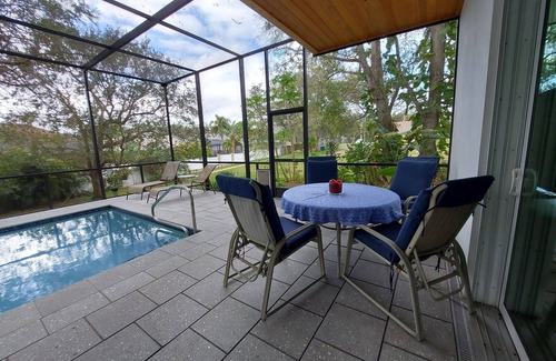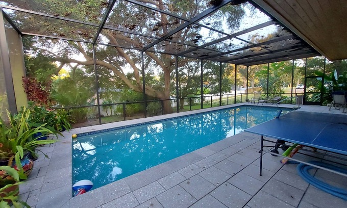 Newly constructed Modern design in Dunedin, entire first floor guest suite with separate entrance, open plan Great Room - Kitchen, with lots of light, screened and solar heated 40 ft. private lap pool, table tennis, fitness room, bicycle 10 mins. to Pinellas Trail, 15 mins. to Honeymoon Island. Wheelchair accessible. Private Pool, Pooldeck and backyard located on west side of home.