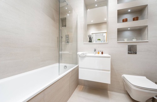 The bathroom is boutique hotel chic, has a bathtub and heated towel rail for added comfort.