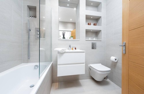 The bathroom is boutique hotel chic, has a bathtub and heated towel rail for added comfort.