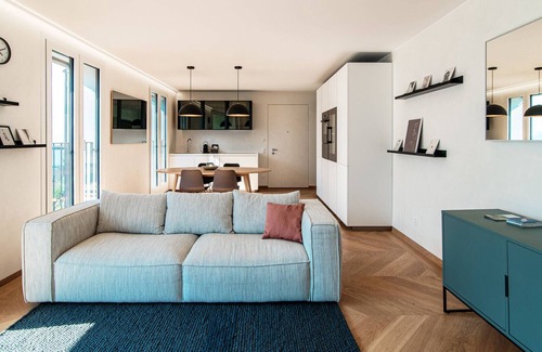 This modern three-room apartment, furnished with flair, is located inside a newly built building in a scenic area of Gandria, a picturesque Ticino village bathed by the lake.