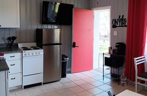 Welcome to Drutopia! This one bedroom lakefront condo is small but just the right size for a couple. Complete with several amenities to make for a relaxing stay. Featuring a gorgeous view of Lake Hamilton right out front your door. Large salt water swimming pool overlooking the lake, boat ramp, grilling area, outdoor seating, fire pit and a breathtaking views that are an extension of the condo. It is tucked into this quite, lakefront, gated property. The newly remodeled modern space features a full kitchen with stove, refrigerator, microwave, cookware, Keurig coffeemaker, Free Wi-Fi with 40” flat screen TV and Roku streaming device in living room area. Bedroom includes a queen bed, 24in smart TV, USB charging plugs, black out curtains and white noise machine to help you relax even more after a day on the lake.