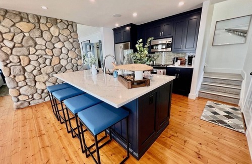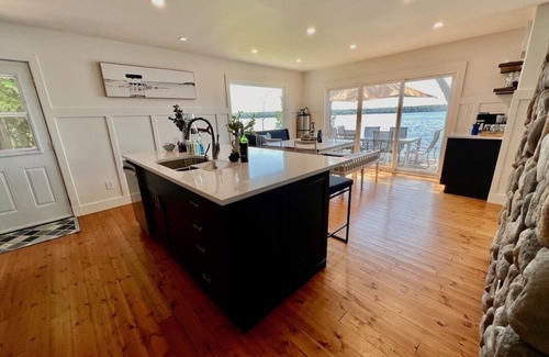 Modern kitchen with dining table (seats 8) plus kitchen island (seats 4), coffee bar area and easy access to exterior deck that faces water, modern family room with ceiling fan and wood fireplace with room to sit 8-10. New windows throughout cottage. Brand new bathrooms on both levels.