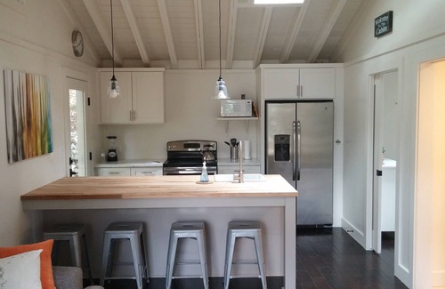 The master bedroom has a queen size bed and closet, the second bedroom has a full size bed and a loft with another full size mattress. The "great room" is furnished with a large sofa, 40" SMART TV (BRING YOUR PASSWORDS), cable & high speed WiFi, and is anchored at one end by the open kitchen. A large butcher block peninsula seats 4 for meals with additional seating at the custom outdoor living area.