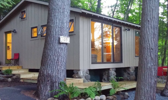 Not your grandma's cabin. This one of a kind property is light and bright with vaulted ceilings, a full kitchen with stainless steel appliances - including a dishwasher, and a spa like bath that feels more like a 5 star resort then a cabin in the Adirondacks. This small cabin lives large thanks to vaulted ceilings, skylights in every room, and space saving pocket doors throughout. It is the perfect place for a small family, couples get-a-way, or girls weekend.