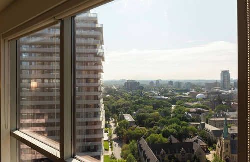 Modern and large 1,170 sq.ft fully equipped two bedroom and two bathrooms condo on Bay Street close to Queen's Park and Yorkville. Assigned indoor free parking.