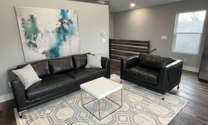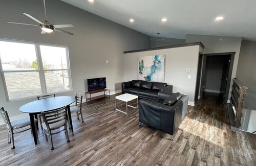 Industrial modern with a touch of Kentucky. You will love this brand new construction built specifically for Airbnb travelers. Large comfy beds and a fantastic open vaulted living space to hang out, watch a game or movie or head out to the sky deck when the weather is nice.