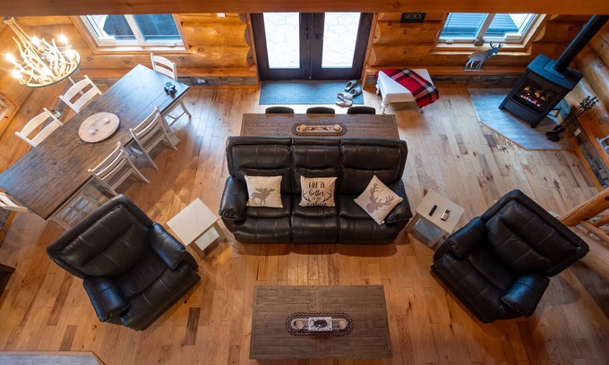 Escape to rustic charm in this inviting rustic log cabin with a modern touch. With 2 bedrooms, 1.5 baths, and an open concept living room and kitchen, unwind in style. Cozy up by the fireplace or head to the loft for a peaceful retreat. Perfect for a family getaway or a romantic escape, immerse yourself in nature's beauty while enjoying modern comforts. Whether you're gathering around the fire table or cooking together in the fully stocked kitchen, our Timber Pines Cabin is welcoming for all. Note: It is not on the water. Public beach and boat launch 5 min away