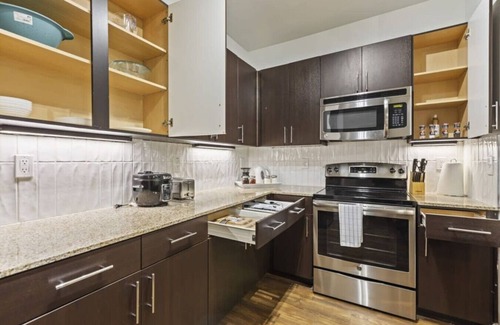 Newly renovated apartment, featuring high-end furnishings and upscale decor. Enjoy luxury amenities such as granite countertops, kitchen islands, and stainless steel appliances, ensuring everyday comfort from morning to night.