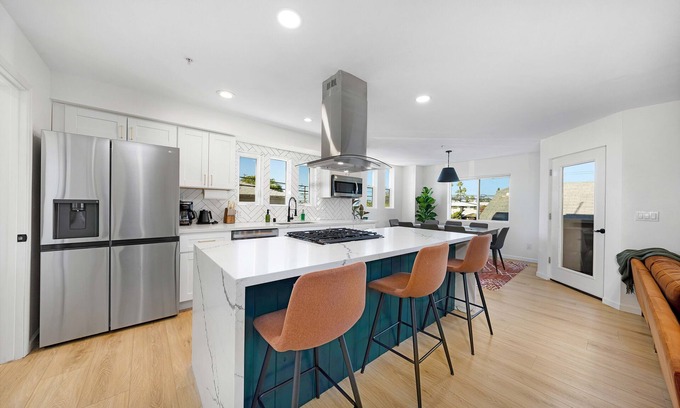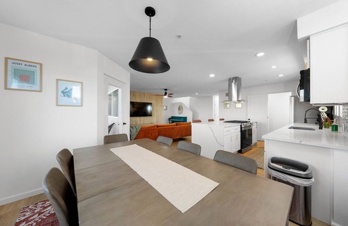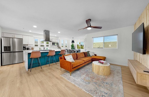 a modern kitchen, multiple areas to host and hang, three balconies, dedicated workspaces, 3 beds/3 full baths, Pack-N-Play, air mattress, and a rooftop deck with killer views.