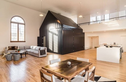 The Hellena is a newly converted 1930’s church that offers modern luxury living in the heart of Denver. Converted in 2016, the space boasts two gorgeous master suites, a brand new kitchen with a 13ft. waterfall island, newly installed gas fireplace, and a light-filled choir loft. The Hellena also has a one-of-a-kind tiny house inside the space that includes another private bedroom and bathroom.