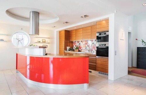 As soon as you step inside, you'll be struck by the soaring 8-meter ceilings, creating an airy and spacious ambiance that's simply breathtaking. The heart of the home is the magnificent kitchen, featuring a spot-built kitchen island in a vibrant Ferrari-red, the natural focal point of the room. Imagine whipping up culinary delights on this stunning piece of art, as friends and family gather around, sipping on bubbly and laughing with joy.