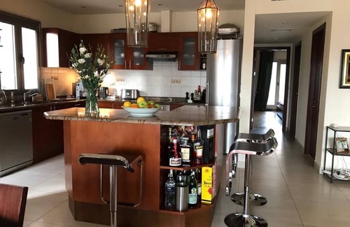 The apartment has a master Suite Bedroom with King size bed and Bathroom. A second bedroom with 2 queen beds and full bathroom. A third Guest bathroom. Living room with a wall mounted flatscreen TV, a full dining room and open kitchen with fully equipped amenities. Rainforest Marble Countertop with bar seats , Liebherr refrigerator, dishwasher. Washer and Dryer.