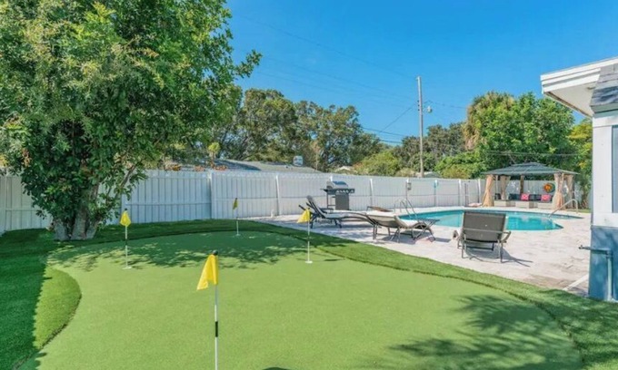 Featuring a huge back yard, inground pool, custom putting green, outdoor grill and beautiful lounge area for lots of guests to be comfortable.