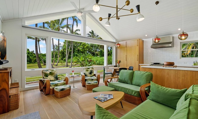 A stylish reimagining of our ever-popular Coconut Hut. This perfectly positioned gem sits in a secluded park-like paradise within a 5-minute walk to the idyllic Anini beach. With new construction, the house contains hardwood floors, whole house water filtration, AC in all rooms, portable Sonos speakers, and WiFi indoors and on the deck. The living spaces boast a large fold out flat screen TV, Wolfe range with indoor grill, LG washer/dryer, dishwasher, refrigerator, and freezer with ice maker. There is a Heston outdoor bbq for grilling.