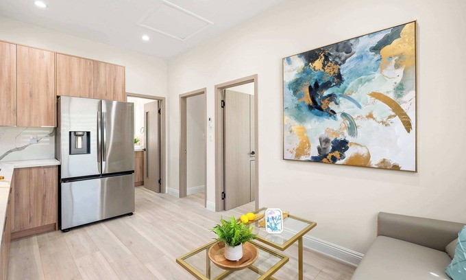 Cook with ease in the fully equipped modern kitchen featuring sleek cabinetry and stainless steel appliances. Everything you need to whip up a quick breakfast or a full dinner is ready for you.