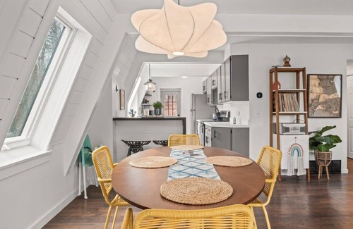 The galley-style kitchen is equipped with an electric range and a countertop that seats 2, perfect for casual meals or morning coffee. Gather around the dining table that seats 6 for family dinners or game nights.