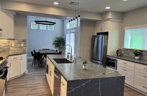 The fully remodeled kitchen is a chef’s dream with sleek quartz countertops, a large island with seating, stainless steel appliances, and custom cabinetry. Whether you’re cooking a family meal or enjoying takeout, this kitchen has everything you need.