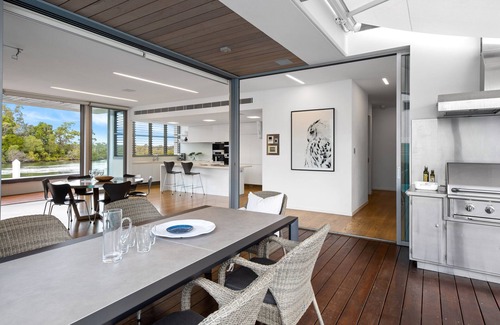 Grab your morning coffee and take a seat at the breakfast bar with the morning paper in hand or stretch out along the padded bench with a good book in hand. For more active pursuits, stairs lead down to an expanse of emerald lawn, a private slice of river beach and a jetty and pontoon partially available for guest use. These open up a world of wonder on, above and under the water, from fishing and swimming to kayaking and paddleboarding. It’s a rare chance to reconnect with nature in the most beautiful of surrounds.