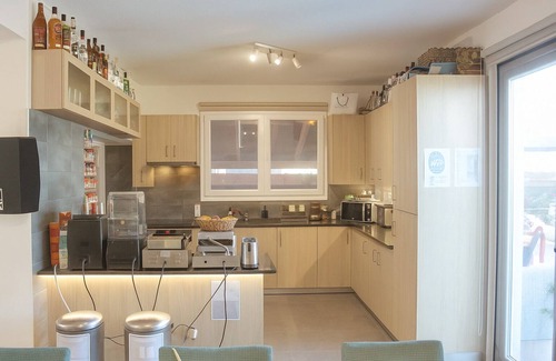 Inside, the ground floor features a fully equipped open-plan kitchen with a large fridge, washing machine, dishwasher, oven, stovetop, and various kitchen appliances that leave nothing to be desired. Right next to it is the dining area with a table for eight and a cozy living room with a 65-inch LED smart TV, a comfortable sofa, and a desk. A special highlight is the private gym, equipped with a treadmill, exercise bike, leg press, incline bench, lat pulldown, Smith machine, front & hack squat station, plenty of weights, and a 42-inch smart TV.
