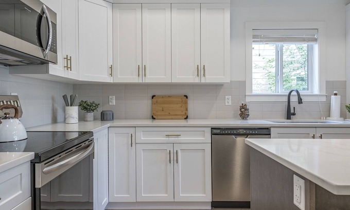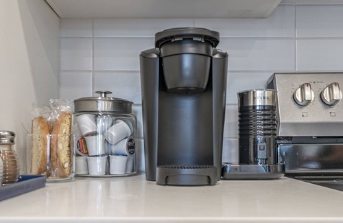 Modern but cozy Scandinavian design perfectly combines style with function in this ground level 2-bedroom, 2 bathroom condo that easily sleeps 4. Unwind in the inviting living room bathed in natural light and 10’ soaring ceilings. Curl up on the sofa and enjoy free WiFi while streaming your favorite program on the 50” Smart TV. While out exploring the city be sure to stock up on the fresh produce, artisan goods and local wines and show off your culinary prowess in the sleek, modern and well-stocked kitchen with stainless steel appliances and a massive island with quartz counters. Room for everyone to gather around with 4 bar stools. The Master bedroom is a relaxing escape with a king platform bed and high-end foam mattress. Store your suitcases away in the walk-in closet and refresh in the master en-suite walk-shower. The second bedroom offers comfortable twin beds that can be arranged into another king bed upon request. Need to do a little work from home? There is a desk and swivel chair. Relax and enjoy a homemade latte or cappuccino from the fully stocked coffee bar.