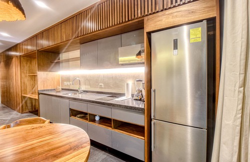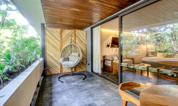 A sun stay awaits you at this warm and modern studio in the heart of Tulum. This studio is perfect for those looking to explore and have easy access to the beach, shops, and restaurants. After a full day of excitement, enjoy an evening cocktail and breathe in the fresh air on the spacious private balcony. The entire space is designed for efficiency and ease - you'll always feel like there's enough space to relax. The kitchenette features a full-size refrigerator and spacious countertops for food preparation. The high-end furnishings include a comfortable couch for reading and unwinding after a day at the beach. Cool off in partial air conditioning or enjoy a space heater for personalized warmth. Good times begin at this gorgeous apartment.