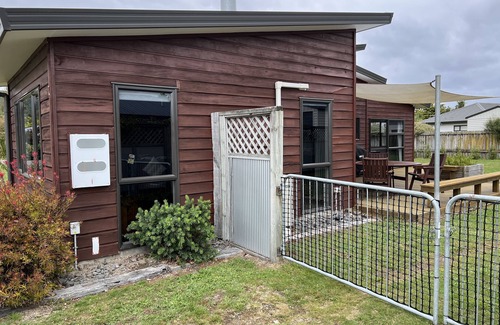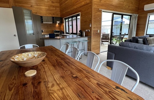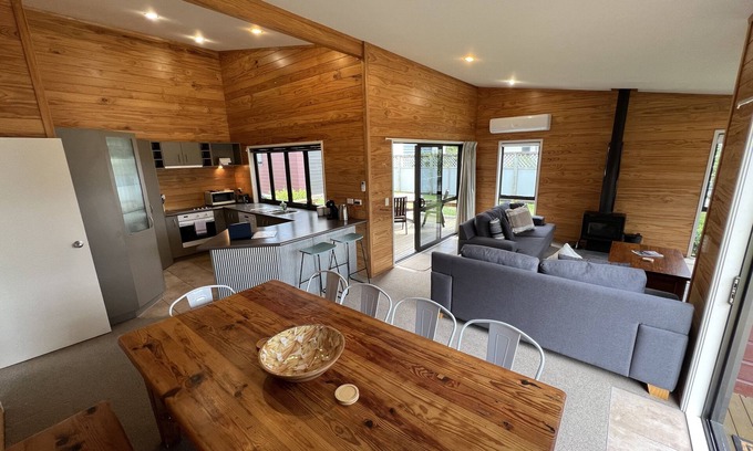 Gorgeous cedar-clad holiday home. Modern and all on one level with fully fenced yard, north facing outdoor deck with seating for 10. This bach is a 300m stroll through the park with tennis courts to beautiful lake, marina & shop.