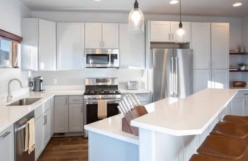 Modern and spacious with a good blend of spaces to gather and spaces to retreat to, this home hosts up to 12 guests. Two families can share it easily, with three bedrooms and two baths upstairs and a private basement with a bedroom, a sleeper sofa, and a separate full bath.