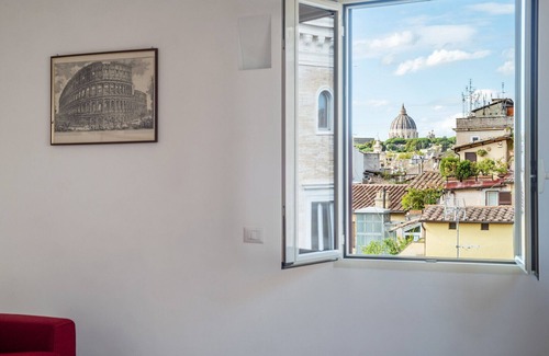 The Pellegrino 11 studio has been carefully and lovingly renovated respecting the original building’s unique elements, but putting the guest’s comfort front and center: double glazing maintains the studio’s temperature and keeps noises at bay, designer radiators (with independent heating) and an A/C system have just been fitted in and the comfortable sofa bed turns boasts a 10cms (over 4 inches)-thick mattress. A one-wall fully-equipped kitchen comes complete with Nespresso, kettle, toaster oven and mini fridge+freezer. A washing machine (no dryer) is also available in the mini-closet, where you will be able to store your luggage. The studio’s bathroom is tiny but efficient. The real star of the Pellegrino 11 studio, though, is the terrace - an extremely rare feature in this neighborhood, and particularly considering its size. Partly facing Palazzo della Cancelleria, the first Renaissance building to be built in Rome, it offers astounding views over the heart of Rome, including St. Peter’s Basilica, and it can be effectively used as an extra room: enjoy it for your meals, for your aperitivo in the evening, or simply to relax! Amenities for this accommodation also include a smart-TV and a free Wifi connection is offered to all guests.