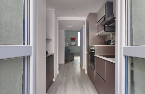 The living area is tastefully furnished with comfortable sofas and a flat-screen TV, perfect for relaxing after a day in the city. The modern kitchen is fully equipped, ready to meet all culinary needs.