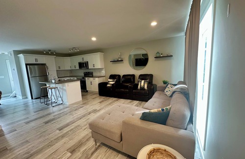 Modern townhouse just an 8 minute walk from the beach! Cozy place to stay that feels like home. All necessities included to have a great stay. Lots of near by activities such as the beach, trails and Lakeshore Drive. Games, cards and a 55” TV that includes Netflix and YouTube. Plenty of parking with a private spot in the back and street parking in front. Barbecue available on a great deck. The beach, bars, breweries and restaurants all within walking distance. Laundry available upon request. Pet friendly upon approval with fee.