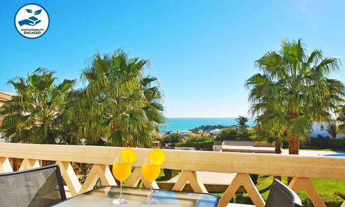 It has two bedrooms, one with a double bed and another with two single beds, both with built-in wardrobes and private bathrooms. The master bedroom includes a balcony with stunning views of the pools, gardens, and sea.