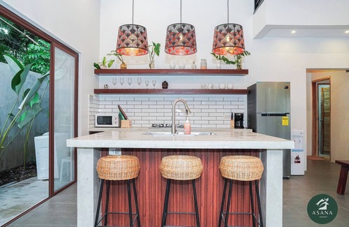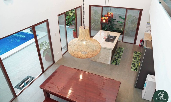 The villa boasts high ceilings and an open-concept living room and kitchen, creating a refreshing space where you can enjoy the fresh air and the beauty of nature. Designed in a modern tropical style, the villa is surrounded by lush tropical plants, enhancing its serene and picturesque environment.
