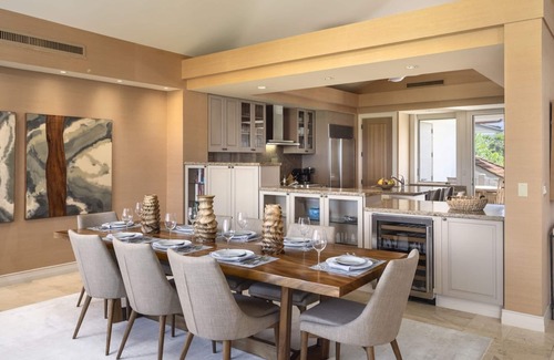 With one of the most extensive floor plans of any Hualalai Resort villa, this ultra-luxe home is spread across two levels. Overlooking the 15th hole of the Jack Nicklaus signature championship course, Palm Villa 130B boasts stunning wraparound views including lush tropical flora, Mount Hualalai and the shores of Maui, and the iconic Hawai‘i sunset over the ocean each evening. After a full day of adventuring around the Big Island, you can enjoy endless entertainment with this home’s four large smart television sets, high-speed wireless internet, and a state-of-the-art Sonos sound system. With high-vaulted ceilings, central air conditioning & ceiling fans, and a multitude of large window displays, this exquisite property allows fresh air and natural light to flow throughout the deluxe space.