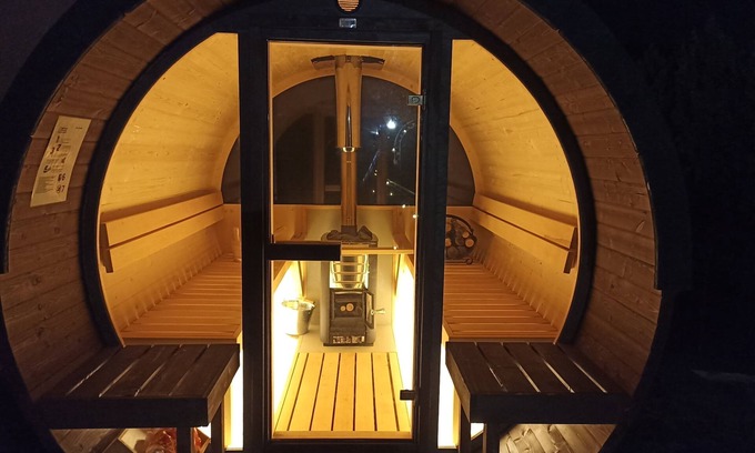 Patio relaxation area and sofas under awning with a special and original Finnish sauna.