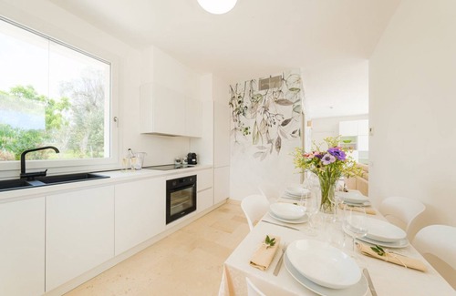 The entrance to the living room immediately gives an idea of the minimal but highly sought-after taste for the furnishings: the large wall decorated with shades of green recalls the external colors, creating a homogeneous and relaxing environment. The kitchen has a table and chairs, a dishwasher, induction hob, coffee machine, kettle, and toaster. The three bedrooms, one double with ensuite bathroom, one double and one twin (with beds that can be joined if necessary) are very bright and quiet and are the ultimate private spaces to enjoy maximum leisure on holiday. The three bathrooms, two of which are complete with a shower, are colorfully characterized and fit perfectly into the environment, offering maximum comfort and privacy to all guests.