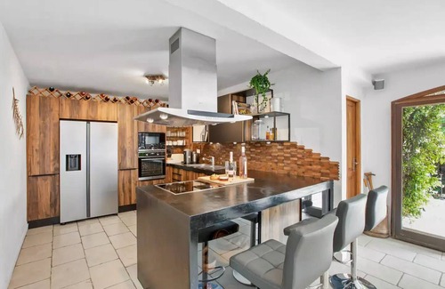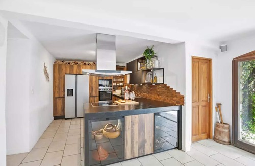 Enter the home via the garden level, where three large arched doorways open to create a magnificent harmony with the lower terrace and pool spaces for an expanded entertainment area. The open-concept living areas are welcoming with a large sectional sofa and 65” SmartTV with Apple TV and Sonos surround sound throughout and into the garden. The dining table comfortably seats 8 for formal dining, with an additional 8 for alfresco dining on the teak patio table. The kitchen has been completely remodelled in 2022 and is fully loaded with everything that you need to entertain in the South of France including side by side fridge and freezer with an ice maker, induction stovetop and built-in oven and microwave, Nespresso original coffee machine and blender. There are many extras such as a soda stream, milk frother, fondue set, sushi-making items and a pasta maker.