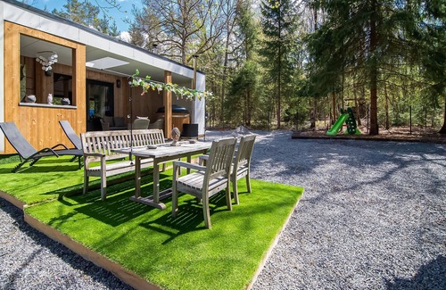 bathtub or shower, hot tub, sauna(private, 4 persons), washing machine, terrace(20 m2), garden(private, fenced, landscaped garden), garden furniture, sun loungers, BBQ, parking, trampoline, deckchairs, parasol, play equipment, slide, children's bed, lounge set, Sunscreen, Swing set, Charging post for electric cars, Surveillance camera