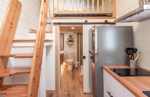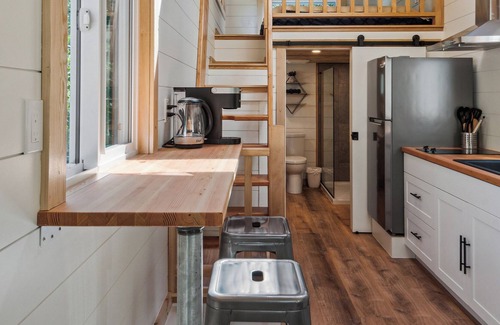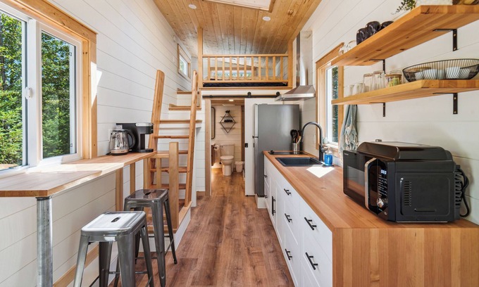As you enter, you'll be greeted by the spacious living area,perfect for relaxing and unwinding. The loft features a queen bed overlooking the living space, giving you a peaceful night's sleep amidst the forested surroundings. The well-equipped kitchen features a full-size fridge, convection oven/air fryer/microwave combo machine, and a Keurig coffee machine. All the necessary utensils and cooking accessories are provided, ensuring you have everything you need to prepare delicious meals during your stay. The spa-like bathroom offers a washer/dryer dual machine and a luxurious spa-like shower. Please note that the bathroom height is 61 inches.