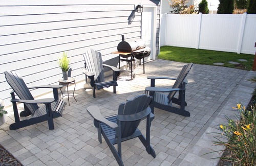 And for those warm evenings, a lovely stone patio with charming Adirondack chairs and a BBQ/smoker, is nestled between the home and the separate garage. The private backyard is fenced-in completely. The landscaping and lawn are well kept and maintained.