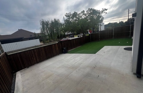 Third floor offers a lounge& sectional bed with smart TV and master suite with King bed, en-suite bath, soaking tub, and balcony with skyline views. Enjoy a modern kitchen, open living room, TVs in every space, washer/dryer, patio, fenced yard, free parking, and fast WiFi. Prime location less than 10 mins to downtown and 16 mins to Love Field Airport.
