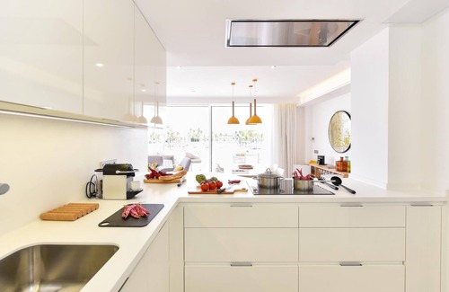 This very bright and spacious holiday flat has 3 bedrooms; two of them with two single beds each and the master bedroom with a double bed. There are 3 bathrooms, all of them with shower. The kitchen has all the accessories and appliances to make your stay as enjoyable as possible, with dishwasher, oven, microwave, washing machine, toaster and everything else you need.